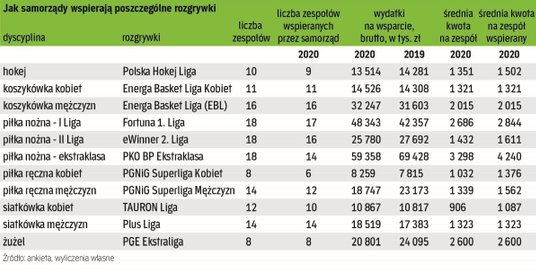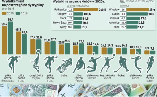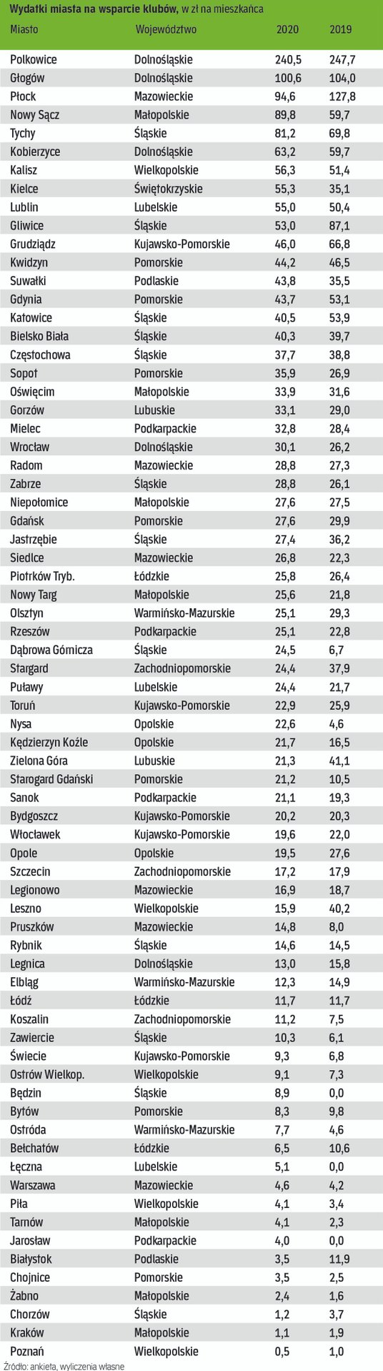 Biorąc pod uwagę wsparcie klubów wyrażone w kwotach bezwzględnych, wyraźnie widać dominację dużych miast wojewódzkich. Zupełnie inaczej wygląda sytuacja, jeśli przeliczymy kwotę wsparcia na liczbę mieszkańców. Tutaj prym wiodą Polkowice, które aktywnie wspierają pierwszoligowy zespół piłki nożnej Górnik oraz zespół koszykówki damskiej CCC. Kwota wsparcia klubów w przeliczeniu na mieszkańca w tym przypadku wyniosła w 2020 r. aż 241 zł. To znacznie więcej od kolejnych w zestawieniu Głogowa (101 zł) oraz Płocka (95 zł).