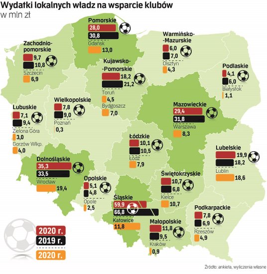 Nasze dane wskazują jednocześnie, że największą aktywnością we wspieraniu sportu wykazują się przedstawiciele województwa śląskiego. Samorządy z tego obszaru w 2020 r. wsparły kluby sportowe kwotą prawie 60 mln zł, zostawiając tym samym resztę stawki wyraźnie w tyle. Warto jednocześnie dodać, że kluby z tego regionu mogą liczyć także na dodatkowe wsparcie. Od 2020 r. w województwie śląskim funkcjonuje stworzony przez śląski Urząd Marszałkowski, ale wzorowany na istniejącym od pięciu lat rozwiązaniu ministerialnym, Program Klub. W pierwszej edycji w ubiegłym roku rozdysponowano 800 tys. zł. Wsparcie wyniosło 10 tys. zł w przypadku klubów jednosekcyjnych i 15 tys. zł dla wielosekcyjnych. W drugiej edycji pula wzrosła do miliona złotych.