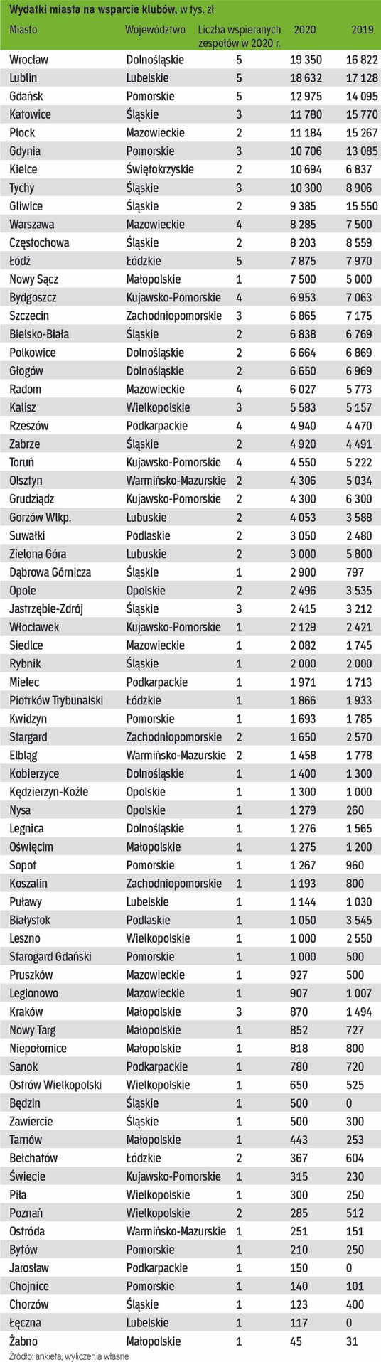 Liderem naszego zestawienia, jeśli chodzi o najwyższą kwotę wsparcia dla klubów w 2020 r., był Wrocław. Miasto na pomoc dla lokalnych zespołów przeznaczyło aż 19,4 mln zł. Kluczowe znaczenie ma tutaj wsparcie piłkarskiego Śląska, który w ubiegłym roku otrzymał ponad 11 mln zł. Drugi w zestawieniu jest Lublin z kwotą ponad 18,6 mln zł, a podium uzupełnia Gdańsk (prawie 13 mln zł).