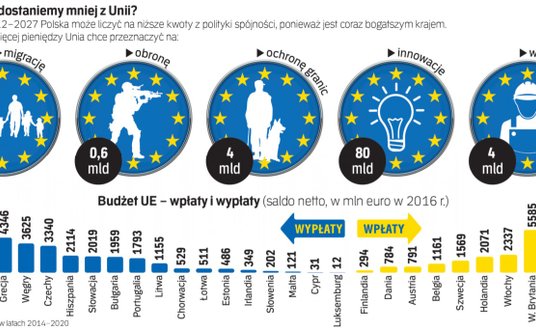 W ciągu siedmiu lat potrzeba będzie na to 50–70 mld euro. Komisja chce, żeby ubytek po brexicie pokryć w połowie z oszczędności na tradycyjnych politykach (w tym przede wszystkim rolnej i spójności, które stanowią razem 72 proc. budżetu UE), a w połowie ze zwiększonych składek pozostałych 27 państw członkowskich. Natomiast nowe cele miałyby być finansowane w 80 proc. z nowych składek, a w 20 proc. z oszczędności. Komisja chce zaproponować, żeby wydatki na politykę spójności zmniejszyły się, w ujęciu nominalnym, o 6 proc. Nie precyzuje, co byłoby bazą dla tych cięć: budżet w cenach z 2014 czy w cenach z 2020 r. Dla Polski oznaczałoby to cięcia 5–15 mld euro w porównaniu z 77 mld euro obecnie.