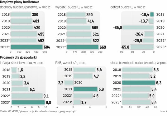 Projekt budżetu przewiduje też wysoki deficyt – w budżecie centralnym ma on wynieść 65 mld zł (wobec 29,9 mld zł w planie na 2022 r.), a w całym sektorze finansów publicznych 4,2–4,4 proc. PKB. Przyczynić ma się do tego m.in. znaczący wzrost wydatków na obronność oraz na zdrowie.