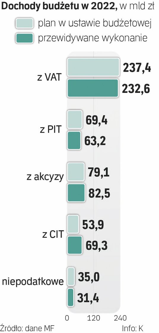Z podatku VAT ma zabraknąć ok. 4,8 mld zł, z PIT – 6 mld zł, a źródła niepodatkowe mają przynieść o ok. 4 mld zł mniej od założonych. Łącznie daje to lukę na niemal 15 mld zł. Przyczyną tych mniejszych wpływów nie jest pogarszająca się sytuacja gospodarcza, ale decyzje podjęte przez rząd w trakcie roku budżetowego. Chodzi przede wszystkim o tarczę antyinflacyjną z obniżonymi stawkami VAT na żywność i energię, projekt przekazania samorządom dodatkowych 13,7 mld zł z podatku PIT czy pomysł przekazania części dochodów ze sprzedaży emisji CO2 na Fundusz Przeciwdziałania Covid-19.