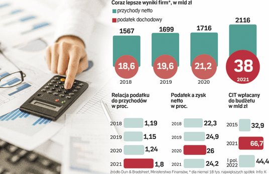 Blisko 18 tys. największych w Polsce firm w swoich sprawozdaniach finansowych za 2021 r. wykazało 2,1 bln zł przychodu, przy 156,8 mld zł zysku netto, od którego zapłaciły 38 mld zł podatku dochodowego – wynika z analizy wywiadowni Dun & Bradstreet, którą „Rzeczpospolita” opisuje jako pierwsza. To wyniki firm największych – uwzględniono tylko podmioty, z wartością podatku dochodowego ponad 50 tys. zł.