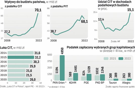 – Można oczekiwać załamania się dochodów z CIT i spadku realnej dynamiki ich wzrostu już w 2023 r. – komentuje Kamil Sobolewski, główny ekonomista Pracodawców RP. – Perspektywy dla gospodarki nie są różowe, wchodzimy w okres spowolnienia, wyniki finansowe firm będą słabsze niż w minionym roku. Tym samym spadnie też podstawa opodatkowania – analizuje również Jakub Rybacki, główny ekonomista Polskiego Instytutu Ekonomicznego. – Przestrzeń do ograniczenia luki CIT jeszcze istnieje, ale trudno spodziewać się, by zrekompensowało to efekty dekoniunktury – dodaje.