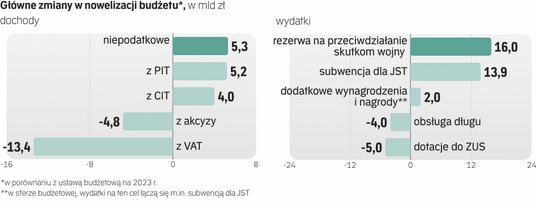 Po stronie dochodów przewidywany jest spadek wpływów ogółem „tylko” ok. 3,1 mld zł. Ale VAT ma przynieść budżetowi aż o 13,4 mld zł mniej niż dotąd się spodziewano, a akcyza – a ok. 4,8 mld zł mniej. Z uzasadnienia Ministerstwa Finansów wynika, że po części to efekt niższego od wcześniejszych założeń popytu konsumpcyjnego. A po części – utrzymania tarczy antyinflacyjnej na 2023 r. w zakresie zerowych stawek VAT na żywność.