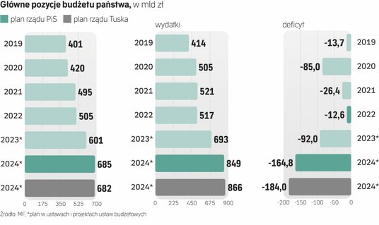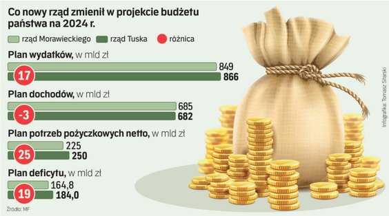 W porównaniu z projektem budżetu pozostawionym przez rząd PiS, gabinet Tuska proponuje zwiększyć przyszłoroczny limit deficytu o ok. 19 mld zł – do 184 mld zł, a wydatki o ok. 17 mld zł – do 866 mld zł. Z kolei dochody budżetowa mają być o niemal 3 mld zł niższe i wynieść 682 mld zł.