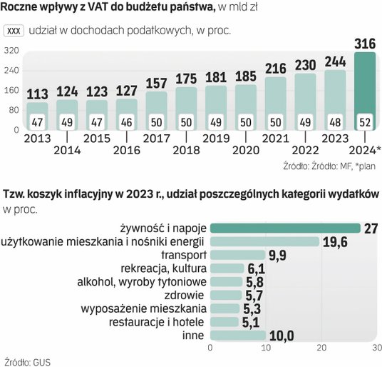 Przypomnijmy, że w budżecie na 2024 r. zaplanowano łączne dochody na poziomie ponad 680 mld zł, dodatkowe ok. 10 mld zł to więc tylko 1,5 proc. Wpływy z samego VAT mają przynieść ok. 316 mld zł przy 5-proc. stawce tego podatku, mogły więc być o 3,2 proc. wyższe (lub o tyle niższe, gdyby rząd utrzymał zerową stawkę).