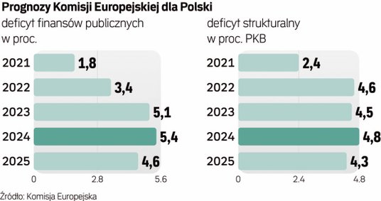 – Nowe unijne ramy fiskalne różnią się od tych obowiązujących poprzednio, szacunki think tanku Bruegel wskazują jednak, że jeśli powrót do odpowiedniego poziomu deficytu wymagany będzie przez cztery lata, to chodzi o dostosowania rzędu 0,8 proc. PKB rocznie – mówi nam Piotr Kalisz, główny ekonomista Citi Handlowego. – Jeśli będzie można iść mniejszymi krokami, a ścieżka zostanie wydłużona do siedmiu lat, to mowa o 0,5 proc. PKB rocznie – zaznacza Kalisz. W każdym z tych przypadków mowa o kosztach liczonych w dziesiątkach miliardów złotych. Przy założeniu, że punktem odniesienia jest 2023 r., gdy nasz PKB wynosił ok. 3,4 bln zł, dostosowania mogą sięgać od 17 mld zł do 27 mld zł rocznie odpowiednio dla ścieżki siedmio- i czteroletniej. Za to w 2025 r. wartość PKB ma wynosić już niemal 4 bln zł i konieczna redukcja deficytu może już sięgać 2031 mld zł.