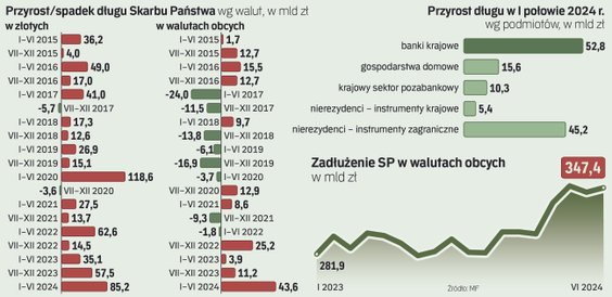 Z danych MF wynika, że największa część nowego długu trafia do inwestorów krajowych, czyli tzw. rezydentów (w pierwszej połowie tego roku to łącznie 78,3 mld zł). Największym kupującym są tu krajowe banki komercyjne (zarówno te państwowe, jak i prywatne), które zwiększyły swój portfel rządowych papierów wartościowych o ok. 52,8 mld zł. Dla banków to wciąż opłacalna inwestycja, a do tego pomniejszająca tzw. podatek bankowy.