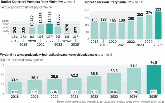 W kolejnych latach taka polityka była kontynuowana, a dopiero w 2024 r. budżet Kancelarii Prezesa Rady Ministrów ograniczono do 2 mld zł. Aż 1,3 mld zł z tej kwoty stanowiła jednak działalność Rządowej Agencji Rezerw Strategicznych. W planach na 2025 r. premier Tusk nie będzie miał już pod sobą RARS, stąd i całość wydatków znacząco spadnie.