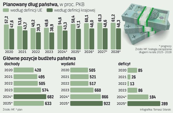 Trzeba tu dodać, że zgodnie z polskimi ustawami (a te dotyczą limitu zapisanego w konstytucji) dług publiczny można liczyć w pewnymi wyłączeniami i wyjątkami. W takim ujęciu tzw. państwowy dług publicznych (PDP) ma być znacznie niższy i wynosić 43,3 proc. PKB w 2024 r. i 47,1 proc. w 2025 r. W 2027 r. ma to być 48,6 proc. PKB, po czym spaść ma do 48,3 proc. PKB w 2028 r. – W horyzoncie strategii relacja państwowego długu publicznego do PKB pozostanie bezpiecznie poniżej progu ostrożnościowego 55 proc. PKB określonego w ustawie o finansach publicznych – zaznacza resort finansów.