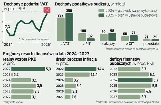 Projekt przygotował jeszcze rząd PiS, a rząd koalicji 15 października niejako przejął go w spadku. Zakładał on, że same dochody podatkowe wyniosą łącznie ok. 604 mld zł, czyli niemal 100 mld zł, i o 19 proc. więcej niż w 2023 r. Oczekiwano, że wpływy z VAT urosną aż o 72 mld zł, czyli 30 proc., a z PIT – o 17,5 mld zł, czyli 19 proc.