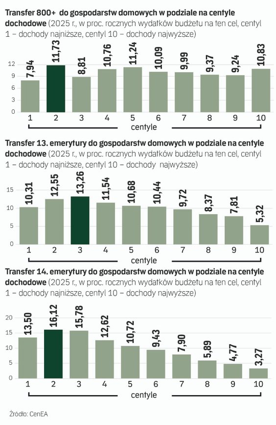 Na transfery socjalne państwo polskie przeznacza potężne pieniądze. Instytut badawczy CenEA w swoim raporcie „Finansowe wsparcie gospodarstw domowych 2025: do kogo trafia »socjal«?” policzył, że w 2025 r. całkowita wartość czterech najbardziej powszechnych elementów wsparcia, czyli świadczenia 800+, 13. i 14. emerytury i dodatku pielęgnacyjnego, wyniesie aż 102,4 mld zł. Do gospodarstw domowych z klasy „średniej” i „wyższej”, czyli do gospodarstw z decylowych grup dochodowych 3-10, trafi przy tym z tego ponad 80 mld zł. Kwota ta zdecydowanie przewyższy wysokość wsparcia kierowanego do osób w najgorszej sytuacji materialnej. Do gospodarstw o niższych dochodach, tych z 1. i 2. dochodowej grupy decylowej, w ramach tych czterech transferów powszechnych trafią bowiem łącznie 22 mld zł.
