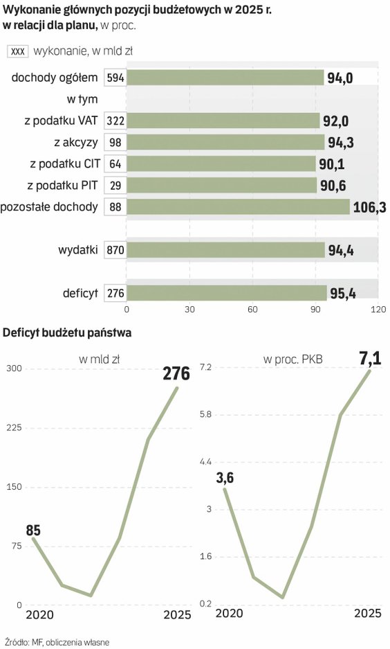 Tak duże ubytki to przede wszystkim efekt słabego wykonania najważniejszych pozycji podatkowych, na poziomie 90–92 proc. Mocno rozczarowały wpływy z VAT – zabrakło aż 27,9 mld zł. CIT przyniósł o 7 mld zł mniej od planu, akcyza – o 5,6 mld zł mniej, a PIT – o niemal 3 mld zł. W pozostałych pozycjach, takich jak np. dochody niepodatkowe, realizacja była nieco lepsza od planu.