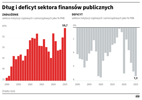 Równolegle do rosnącego deficytu gwałtownie wzrasta zadłużenie kraju. W 2025 r. dług sektora instytucji rządowych i samorządowych wyniósł 2,335 bln zł. W relacji do PKB sięgnął 59,7 proc. wobec 54,8 proc. w 2024 r. oraz 49,5 proc. w 2023 r.