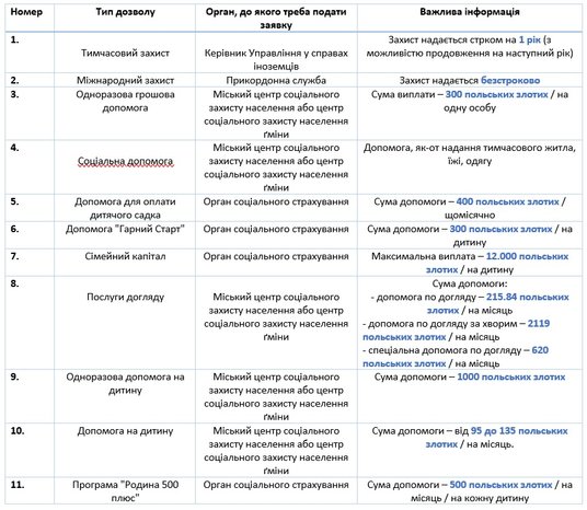 Громадяни України мають право на допомогу у вигляді одноразової грошової виплати у розмірі 300 польських злотих на особу, призначену для утримання (покриття витрат на харчування, одяг, взуття, засоби особистої гігієни та оплату житла).