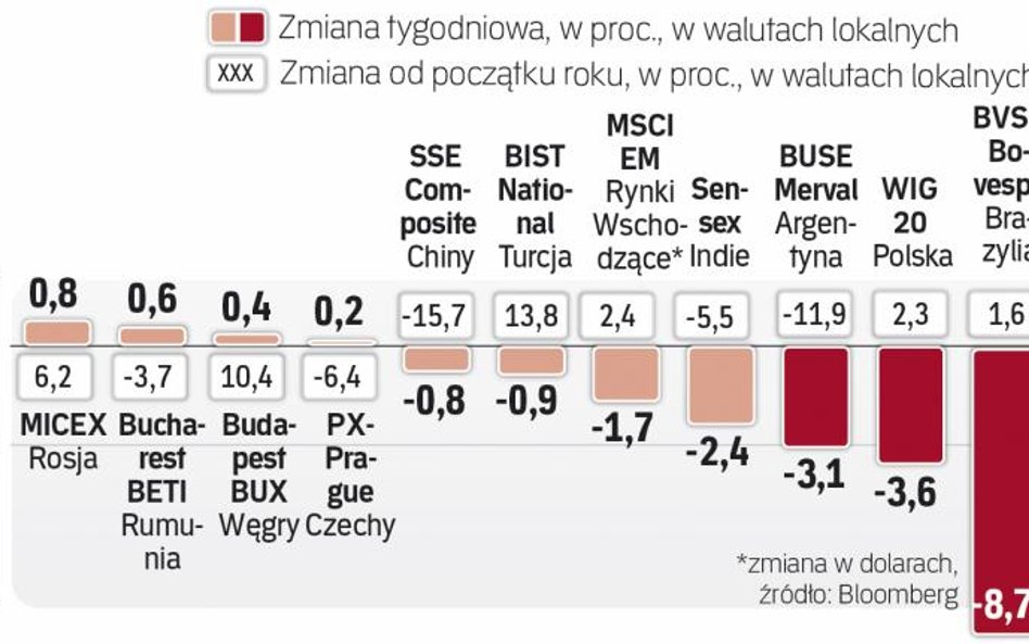 Przez pierwsze trzy dni tygodnia wiele indeksów rynków wschodzących traciło. Spadały bowiem ceny ropy, a Christine Lagarde, dyrektor wykonawcza Międzynarodowego Funduszu Walutowego, stwierdziła, że wzrost gospodarczy na świecie jest wciąż kruchy.