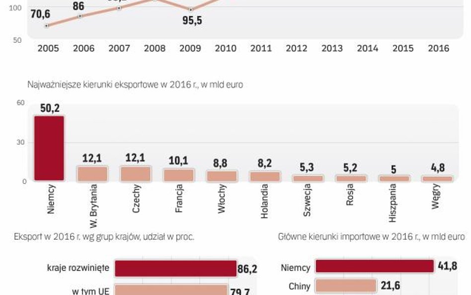 Ubiegłoroczny polski eksport wyniósł 183,6 mld euro. To wynik lepszy niż przed rokiem o 2,3 proc., ale tempo wzrostu, wcześniej imponujące (7,8 proc. w 2015 r.), wyraźnie osłabło. Udało się natomiast utrzymać dodatnie saldo w wymianie towarowej. Jak podał w środę NBP, jego wartość sięgnęła prawie 3,7 mld euro i była to nadwyżka wypracowana drugi rok z rzędu. Ubiegły rok przyniósł także odwrócenie negatywnego trendu spadkowego w sprzedaży polskich towarów na rynkach Europy Środkowo-Wschodniej. Podczas gdy w 2015 r. jej wartość zmalała w ujęciu rocznym o przeszło jedną piątą, w ubiegłym roku zwiększyła się o 6,5 proc.