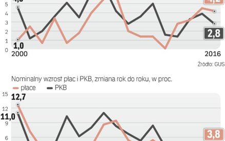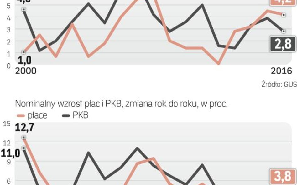 Także w ujęciu nominalnym nasze zarobki wzrosły bardziej (o 3,8 proc.) niż wartość tego, co udało się wytworzyć w gospodarce (3,2–3,4 proc.). W ciągu ostatnich 16 lat, licząc od 2000 r., taka sytuacja miała miejsce tylko pięć razy.