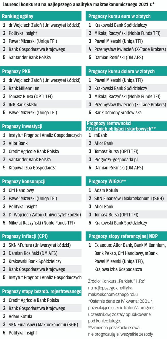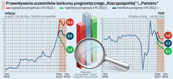 Największą zagadką pozostaje ścieżka inflacji. Przeciętnie ekonomiści spodziewają się, że w II i III kwartale wskaźnik cen konsumpcyjnych (CPI) – główna miara inflacji w Polsce – będzie rósł w tempie nieco ponad 11 proc. rocznie, a w następnych dwóch kwartałach w tempie niespełna 10 proc. Przeciętne prognozy skrywają jednak bardzo duże rozbieżności w scenariuszach inflacyjnych. Przykładowo, zespół analityków z BNP Paribas ocenia, że w I kwartale 2023 r. CPI będzie rósł średnio w tempie 14 proc. rok do roku, podczas gdy dr Wojciech Zatoń, zwycięzca konkursu z 2021 r., spodziewa się w tym okresie spadku inflacji do niespełna 6 proc. Te różnice wynikają m.in. z odmiennych założeń co do momentu wygaszenia przez rząd tzw. tarczy antyinflacyjnej, która obniża inflację o około 3 pkt proc.