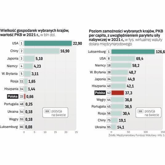 Wielkość gospodarki ma pewne znacznie, jeśli chodzi o pozycję danego kraju w globalnym układzie sił, a także jeśli chodzi o wielkości nominalnych wydatków publicznych (np. na zbrojenia). Jednak do badania poziomu zamożności lepiej posługiwać się miarą PKB per capita z uwzględnieniem różnic siły nabywczej dochodów. Pod tym względem też można mówić o dużych postępach, bo w 2021 r. – według danych Eurostatu – wskaźnik ten wynosił 77 proc. unijnej średniej, a gdy wchodziliśmy do UE, był poniżej 50 proc. W tym wyścigu udało się pokonać takie kraje, jak: Słowacja, Węgry, Grecja i Portugalia.