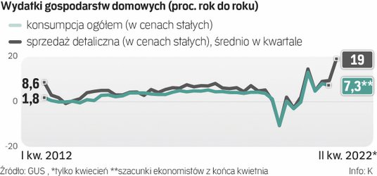 Jak podał w poniedziałek GUS, sprzedaż detaliczna wzrosła w kwietniu realnie (czyli w cenach stałych) o 19 proc. rok do roku, po zwyżce o 9,6 proc. miesiąc wcześniej. W tym stuleciu tylko dwa razy – w kwietniu 2021 r. i w lutym 2008 r. – realna sprzedaż wzrosła bardziej. Ankietowani przez nas ekonomiści przeciętnie spodziewali się przyspieszenia wzrostu sprzedaży do 16,1 proc. rok do roku. Przemawiała za tym przede wszystkim niska baza odniesienia sprzed roku, gdy aktywność w handlu wyraźnie tąpnęła pod wpływem restrykcji wprowadzonych w związku z trzecią falą epidemii Covid-19. Na to nałożyło się jeszcze zaburzenie związane z ruchomą Wielkanocą. W 2021 r. to święto przypadało wcześniej, a kumulacja związanych z nim zakupów nastąpiła w marcu. W tym roku przedświąteczne wydatki realizowane były tylko w kwietniu.