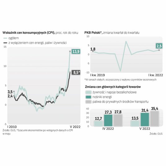 Wskaźnik cen konsumpcyjnych (CPI), główna miara inflacji w Polsce, wzrósł w maju o 13,9 proc. rok do roku, najbardziej od 1996 r. – obliczył wstępnie GUS. Wynik ten okazał się zbieżny z przeciętnymi szacunkami ankietowanych przez nas ekonomistów. To jeden z powodów, aby sądzić, że wzrost cen zaczyna tracić impet. Począwszy od lipca 2021 r., inflacja stale przebijała bowiem oczekiwania większości analityków, a niekiedy nawet skrajne prognozy. To potęgowało wrażenie, że wzrost cen w Polsce stał się procesem całkowicie nieprzewidywalnym i niekontrolowanym.