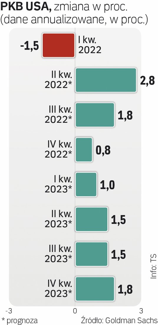 Tymczasem według ekonomistów Goldman Sachs prawdopodobieństwo wejścia USA w recesję w ciągu najbliższych dwóch lat wzrosło z 35 do aż 48 proc. Ich zdaniem ryzyko, że do recesji dojdzie w nadchodzących 12 miesiącach, wzrosło natomiast z 15 do 30 proc.