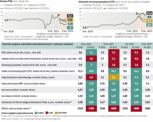Skąd ten przypływ pesymizmu? Jednym z jego źródeł jest większy niż wcześniej oczekiwano skok inflacji i – co za tym idzie – stóp procentowych. Zaledwie kwartał temu ekonomiści przeciętnie oczekiwali, że w II kwartale br. inflacja nad Wisłą wyniesie średnio 11 proc., dzisiaj wiadomo, że była o 3 pkt proc. wyższa. W rezultacie główna stopa procentowa NBP wzrosła do końca czerwca do 6 proc. (a w lipcu RPP podniosła ją do 6,5 proc.) zamiast do 5 proc., jak uczestnicy naszej rywalizacji przeciętnie prognozowali na początku kwietnia.