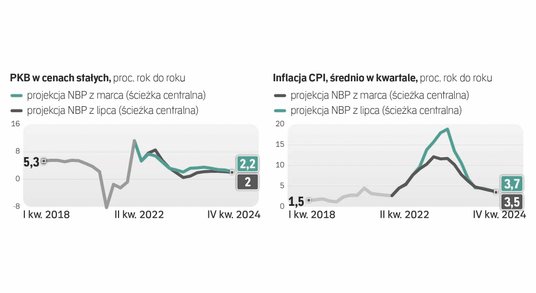 Prezes NBP mówił w piątek, że w świetle nowych prognoz DAiBE inflacja szczyt osiągnie latem br., a potem będzie opadać. – Jeśli prognozy się zmienią i inflacja będzie dalej przyspieszała, będziemy podnosić stopy – deklarował. Tymczasem „Raport o inflacji” sugeruje na pierwszy rzut oka, że inflacja osiągnie szczyt dopiero w I kwartale 2023 r. Co więcej, będzie wtedy znacznie wyżej niż w czerwcu, gdy wyniosła 15,6 proc. Średnio ma wynosić niemal 19 proc., a w skrajnym scenariuszu nawet 26 proc. To kontrastuje z oceną prezesa NBP, że dużego wzrostu inflacji już nie będzie. Prognozy DAiBE nie potwierdzają też, jakoby w 2024 r. inflacja miała wrócić do celu banku centralnego, czyli 2,5 proc., co mogłoby uzasadniać obniżki stóp procentowych już pod koniec 2023 r.