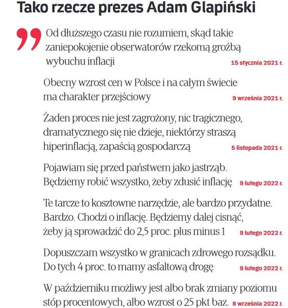 Prezes NBP Adam Glapiński sygnalizował wprawdzie, że stabilizacja stóp w październiku jest równie prawdopodobna, co ich niewielka podwyżka, ale też zakładał, że inflacja nie będzie już istotnie przyspieszała. Wcześniej (np. w lipcu, przed wakacyjną przerwą posiedzeń RPP) deklarował zaś, że jeśli wbrew prognozom inflacja będzie przyspieszała, RPP będzie podnosić stopy.