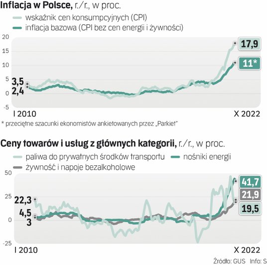 We wrześniu wskaźnik cen towarów i usług konsumpcyjnych (CPI), główna miara inflacji w Polsce, wzrósł o 17,2 proc. rok do roku, a w sierpniu o 16,1 proc. Październikowy skok inflacji był więc łagodniejszy niż miesiąc wcześniej, a część ekonomistów uważa, że listopad i grudzień przyniesie jej stabilizację. Scenariusz jej wzrostu powyżej 20 proc. rok do roku nie jest jeszcze wykluczony. Może zrealizować się na początku 2023 r., ale będzie to w dużej mierze efekt statystyczny, związany z niską bazą odniesienia po wprowadzeniu tzw. tarczy antyinflacyjnej na początku br. Ekonomiści są jednak zgodni co do tego, że od II kwartału wzrost CPI zacznie już hamować. Różnice zdań dotyczą tylko tempa tego procesu.