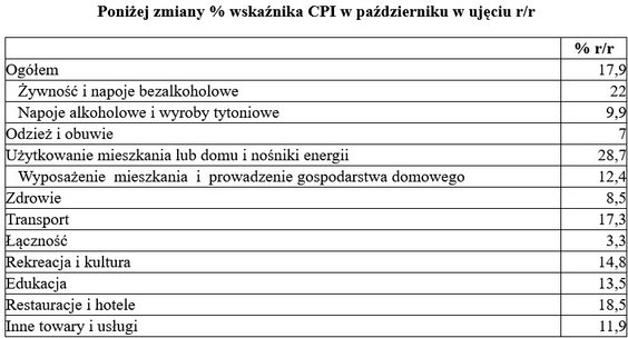 O tym, że wskaźnik cen konsumpcyjnych (CPI) wzrósł w październiku o 17,9 proc. rok do roku, najbardziej od grudnia 1996 r., GUS wstępnie informował już pod koniec minionego miesiąca. We wtorek potwierdził tamten wstępny szacunek, publikując jednocześnie szczegółowe dane o zmianach cen różnych kategorii towarów i usług.
