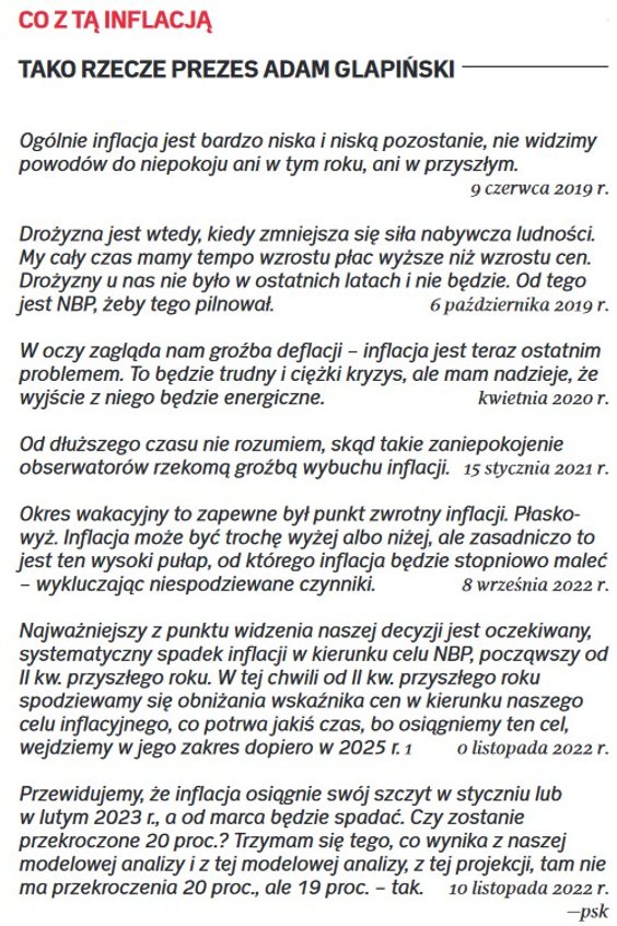 Ankietowani przez nas ekonomiści spodziewali się przeciętnie wyniku na poziomie 18 proc. To pierwszy przypadek od połowy 2021 r., gdy inflacja okazała się niższa od ich oczekiwań. Ba, zaskoczyła nawet największych optymistów, którzy liczyli się z wyhamowaniem inflacji do 17,5 proc. To o tyle istotne, że w ostatnich kwartałach inflacja niemal stale przewyższała prognozy – niekiedy nawet te skrajne – co potęgowało wrażenie, że stała się zjawiskiem nieprzewidywalnym.