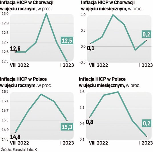 Danych o styczniowej inflacji w Polsce jeszcze nie ma. W grudniu wskaźnik HICP sięgał w naszym kraju 15,3 proc., czyli był wyraźnie wyższy niż w Chorwacji. I wyższy od średniej unijnej, która wtedy wynosiła 9,2 proc. Inflacja w całej UE wyraźnie hamuje, średnią za styczeń Eurostat wstępnie wyliczył na 8,5 proc. Możliwe, że w Polsce poszła w górę, bo z początkiem roku wygasła część elementów tarcz antyinflacyjnych.