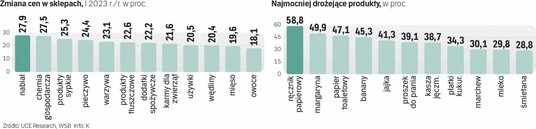 Najnowsza edycja pokazuje nowych liderów najwyższych skoków cen – po miesiącach nową najmocniej drożejącą kategorią jest nabiał, ale jeśli chodzi o produkty, to prowadzą te z papieru, jak ręczniki kuchenne czy papier toaletowy, droższe 50–60 proc. niż przed rokiem. Choć margaryna jest droższa o 50 proc. niż w styczniu 2022 r., to olej już tylko 8,2 proc.