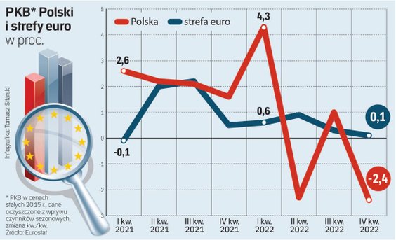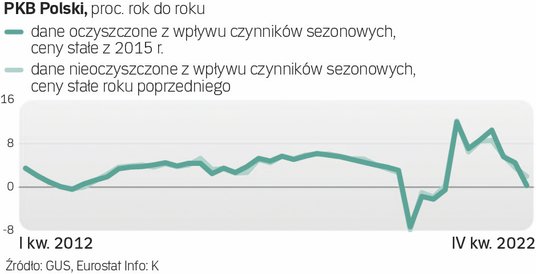 Jak oszacował wstępnie GUS, produkt krajowy brutto Polski, główna miara aktywności w gospodarce, po oczyszczeniu z wpływu czynników sezonowych wzrósł w IV kwartale 2022 r. realnie (tj. w cenach stałych) o zaledwie 0,3 proc. rok do roku, najmniej od I kwartału 2021 r. W stosunku do III kwartału tak liczony PKB zmalał o 2,4 proc. Spośród 15 państw UE, dla których dostępne są takie dane, żadne nie odnotowało w tym okresie takiego załamania aktywności ekonomicznej. W strefie euro zwyżka PKB wyniosła 0,1 proc.