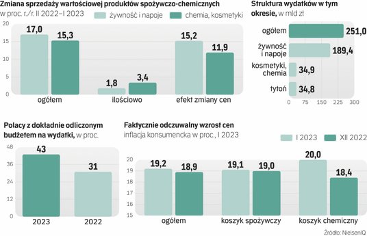 Zmiany na rynku handlowym wywołane zarówno wzrostem inflacji, jak i kosztów, zarówno producentów, jak i handlowców, przekładają się też na to, jak i co Polacy kupują. Z danych NielsenIQ specjalnie dla „Rzeczpospolitej” wynika, że w ciągu ostatnich 12 miesięcy do końca stycznia 2023 r. Polacy na podstawowe produkty chemiczne i spożywcze wydali 251,1 mld zł, co oznacza w ujęciu rocznym wzrost o 16 proc., ale to głównie efekt wyższych cen.