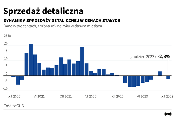 Jak podał w poniedziałek GUS, sprzedaż detaliczna towarów, liczona w sklepach zatrudniających co najmniej 10 osób, zmalała w grudniu realnie (w cenach stałych) o 2,3 proc. rok do roku po zniżce o 0,3 proc. w listopadzie. Już ten listopadowy wynik był sporym rozczarowaniem po tym, jak w październiku sprzedaż wzrosła o 2,8 proc. Łatwo było go jednak wyjaśnić tąpnięciem popytu na paliwa. Ankietowani przez „Rzeczpospolitą” ekonomiści na ogół zakładali, że w grudniu sprzedaż wróciła na ścieżkę wzrostu. Przeciętnie spodziewali się jej zwyżki o 1,7 proc. rok do roku.