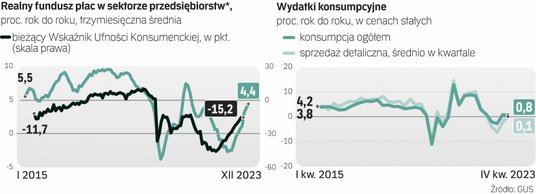Scenariusz boomu konsumpcyjnego opiera się na założeniu, że wzrost płac w 2024 r. trzeci rok z rzędu utrzyma się wyraźnie powyżej 10 proc. Przyczynić mają się do tego kolejna podwyżka płacy minimalnej o 20 proc. oraz podobne lub większe podwyżki uposażeń pracowników sektora budżetowego i nauczycieli. Inaczej niż w poprzednich dwóch latach, szybkiemu nominalnemu wzrostowi płac towarzyszyć ma zdecydowanie niższa inflacja. Według aktualnych prognoz w tym roku wskaźnik cen konsumpcyjnych (CPI) będzie rósł w tempie około 5 proc. rocznie, po 11,6 proc. w 2023 r. i 14,3 proc. w 2022 r. W rezultacie skokowo wzrosnąć powinna siła nabywcza dochodów gospodarstw domowych, i to szczególnie tych mniej zamożnych, które przeznaczają na wydatki największą część swoich wpływów.