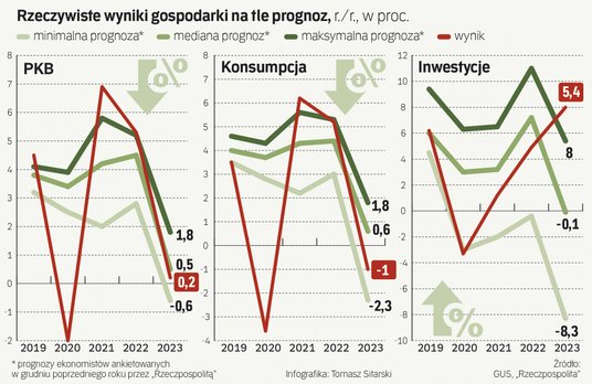 Dodatkowo, część ubiegłorocznego popytu w gospodarce została zaspokojona produkcją z poprzedniego roku. Wtedy firmy na potęgę budowały zapasy, aby w 2023 r. ostro je ograniczyć. Można powiedzieć, że w 2022 r. polska gospodarka urosła (o 5,3 proc.) na kredyt, który w 2023 r. był spłacany. Z tych powodów w grudniu 2022 r. przeciętnie oczekiwano, że w minionym roku PKB zwiększy się o 0,5 proc. Analitycy mocno się nie pomylili.