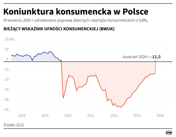 "W kwietniu 2024 r. odnotowano poprawę obecnych nastrojów konsumenckich przy jednoczesnym pogorszeniu przyszłych nastrojów konsumenckich w stosunku do poprzedniego miesiąca. Bieżący wskaźnik ufności konsumenckiej (BWUK), syntetycznie opisujący obecne tendencje konsumpcji indywidualnej, wyniósł - 11,5 i był o 0,8 pkt proc. wyższy w stosunku do poprzedniego miesiąca" - czytamy w komunikacie.