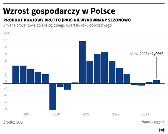 GUS podał, że PKB w 2023 roku wyniósł 0,2 proc., tak jak szacowano wcześniej.