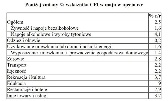"W porównaniu z miesiącem analogicznym poprzedniego roku wyższe ceny w zakresie restauracji i hoteli (o 7,9 proc.), mieszkania (o 1,6 proc.) oraz żywności (o 1,3 proc.) podniosły ten wskaźnik odpowiednio o 0,44 pkt proc., 0,40 pkt proc. i 0,32 pkt proc. Niższe ceny odzieży i obuwia (o 0,2 proc.) obniżyły wskaźnik o 0,01 pkt proc." - czytamy dalej.