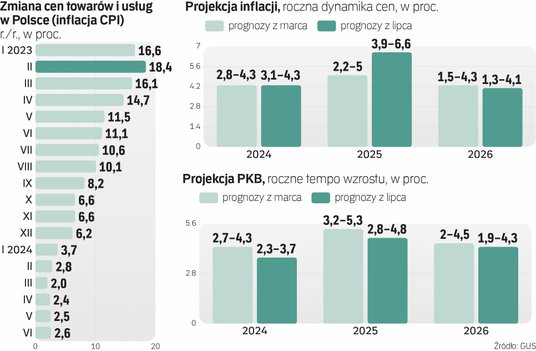 Z kolei roczne tempo wzrostu PKB według lipcowej projekcji z 50-proc. prawdopodobieństwem znajdzie się w 2024 r. w przedziale 2,3–3,7 proc., niżej niż w prognozach z marca (2,7–4,3 proc.). W 2025 r. ma się zmieścić w przedziale 2,8–4,8 proc. wobec 3,2 –5,3 proc. z poprzedniej projekcji, zaś w 2026 r. między 1,9 proc. a 4,3 proc. wobec prognozowanych wcześniej 2–4,5 proc.