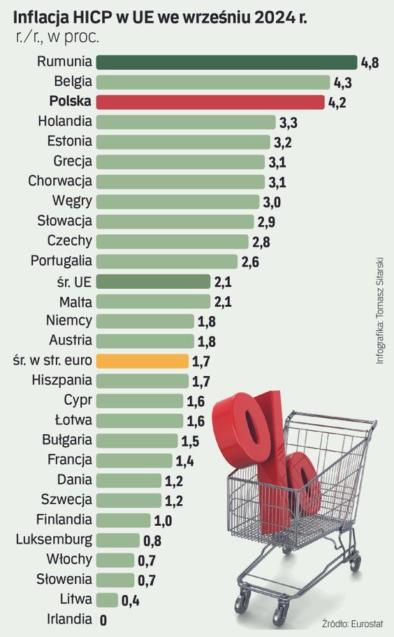 Polska znów zaczyna mościć się wśród unijnych „liderów” inflacji. Wrześniowy odczyt 4,2 proc. rok do roku okazał się niższy tylko niż rumuński (4,8 proc.) i belgijski (4,3 proc.). Jest też najwyższy od stycznia. Ciekawostką (wynikającą właśnie z różnic w wyliczaniu) jest fakt, że skok inflacji HICP w Polsce względem sierpnia był zdecydowanie niższy niż w przypadku inflacji CPI (HICP: z 4 do 4,2 proc.; CPI: z 4,3 do 4,9 proc.). Ten wzrost CPI to m.in. efekt niskiej bazy sprzed roku.