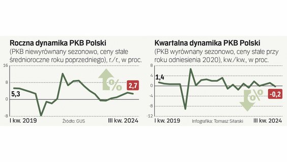Roczne tempo wzrostu polskiej gospodarki w trzecim kwartale (1,7 proc. w stosowanym przez Eurostat ujęciu odsezonowanym) było wyraźnie wyższe niż średnie w UE (1 proc.). Gorzej wypadliśmy w ujęciu kwartalnym – według danych GUS polska gospodarka skurczyła się w trzecim kwartale względem drugiego o 0,2 proc. (wobec solidnego wzrostu o 1,5 proc. w drugim kwartale). To pierwszy taki spadek od drugiego kwartału 2023 r. W tym ujęciu, wśród krajów naszego regionu, większy spadek odnotowały tylko Węgry (-0,7 proc.), średnia zaś dla UE wyniosła +0,3 proc.