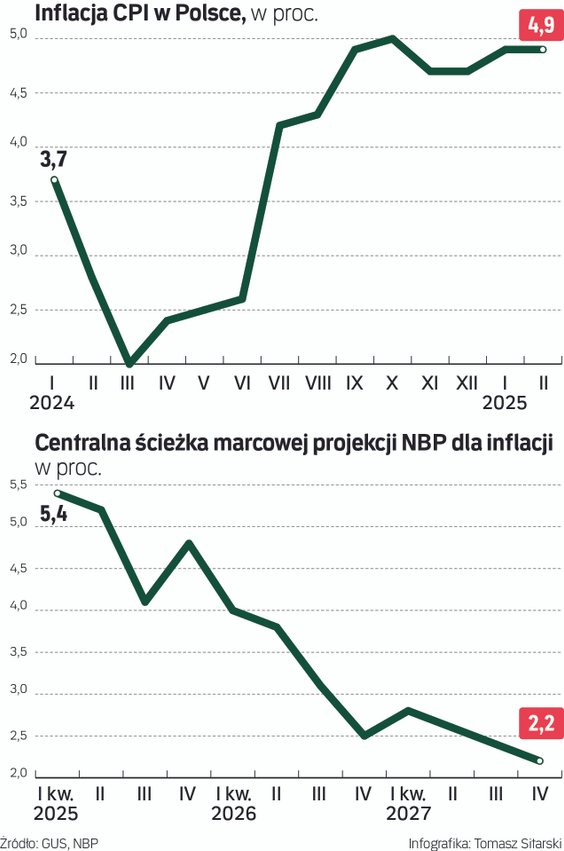 Inflacja w styczniu wyniosła jednak 4,9 proc. rok do roku, nie 5,3 proc. jak miesiąc temu podał wstępnie GUS. Pierwszy odczyt zaskoczył negatywnie, drugi pozytywnie – średnia prognoz ekonomistów dla „Parkietu” była dokładnie pośrodku, na poziomie 5,1 proc. Jeszcze mocniej zdumiał odczyt inflacji za luty – też 4,9 proc., choć analitycy średnio prognozowali wynik 5,3 proc. Ba, żaden zespół nie spodziewał się wyniku z czwórką z przodu.