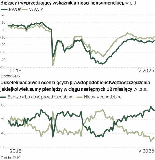 Bieżący wskaźnik ufności konsumenckiej, który zawiera ocenę aktualnej sytuacji własnego gospodarstwa domowego i generalnej sytuacji ekonomicznej kraju, oczekiwania na kolejny rok w obu aspektach oraz obecną gotowość do dokonywania ważnych zakupów, jest ujemny niezmiennie od początku pandemii w 2020 r. To sygnał, że wciąż przewagę mają negatywne odczucia. Niemniej majowy odczyt (-14,5 pkt) okazał się najwyższy od września 2024 r. i zbliżył się do maksimów z połowy dekady (11,5–12,5 pkt na minusie w pierwszej połowie 2024 r.).
