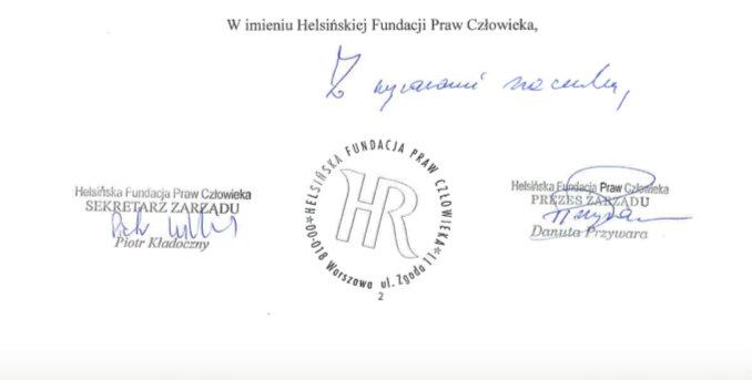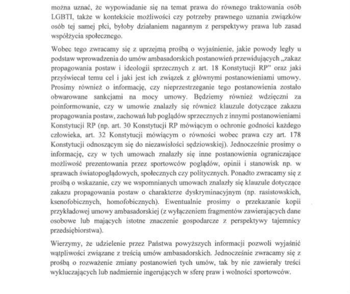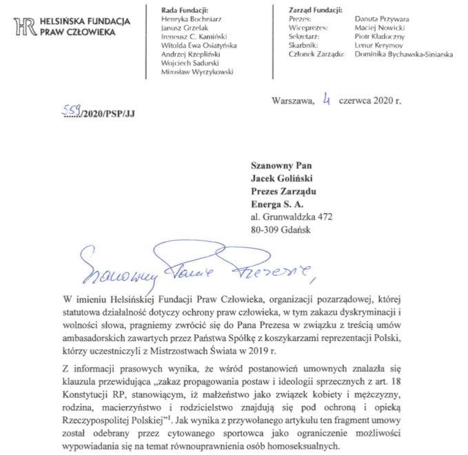 Helsińska Fundacja Praw Człowieka zwróciła się z pytaniem do Prezesa Energi S. A., jaki był cel wprowadzenia do umów ambasadorskich postanowień przewidujących „zakaz propagowania postaw i ideologii sprzecznych z art. 18 Konstytucji RP" oraz jaki jest ich związek z głównymi postanowieniami umowy. Ponadto, fundacja poprosiła o informację, czy nieprzestrzeganie tego postanowienia zostało obwarowane sankcjami na mocy umowy, czy w umowie znalazły się również klauzule dotyczące zakazu propagowania postaw, zachowań lub poglądów sprzecznych z innymi postanowieniami Konstytucji RP oraz czy w umowach znalazły się inne postanowienia ograniczające możliwość prezentowania przez sportowców poglądów, opinii i stanowisk np. w sprawach światopoglądowych, społecznych czy politycznych.